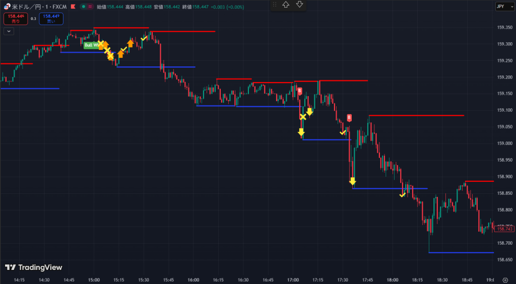 特に動かず建値で決済。その後すぐ目線を変えられずほぼ同じレートでショート。