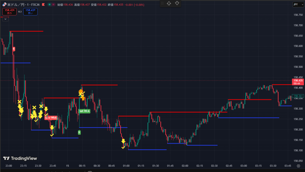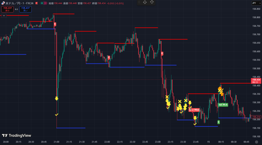 21時のHLによる急激な下げにギリギリ乗ることができ+10Pips獲得。ここでプラ転。
